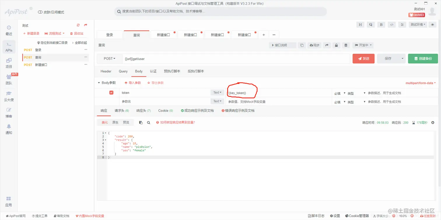 9.然后我们去查询页面引用token,和引用环境一样的方法{{}}中加变量名