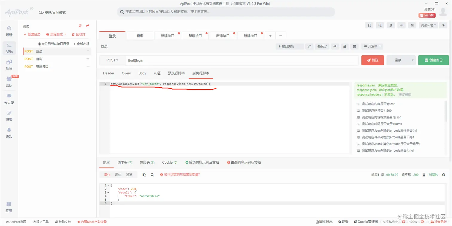 这里的response.json.result.token的意思是这个response请求中json的resul中的token值。