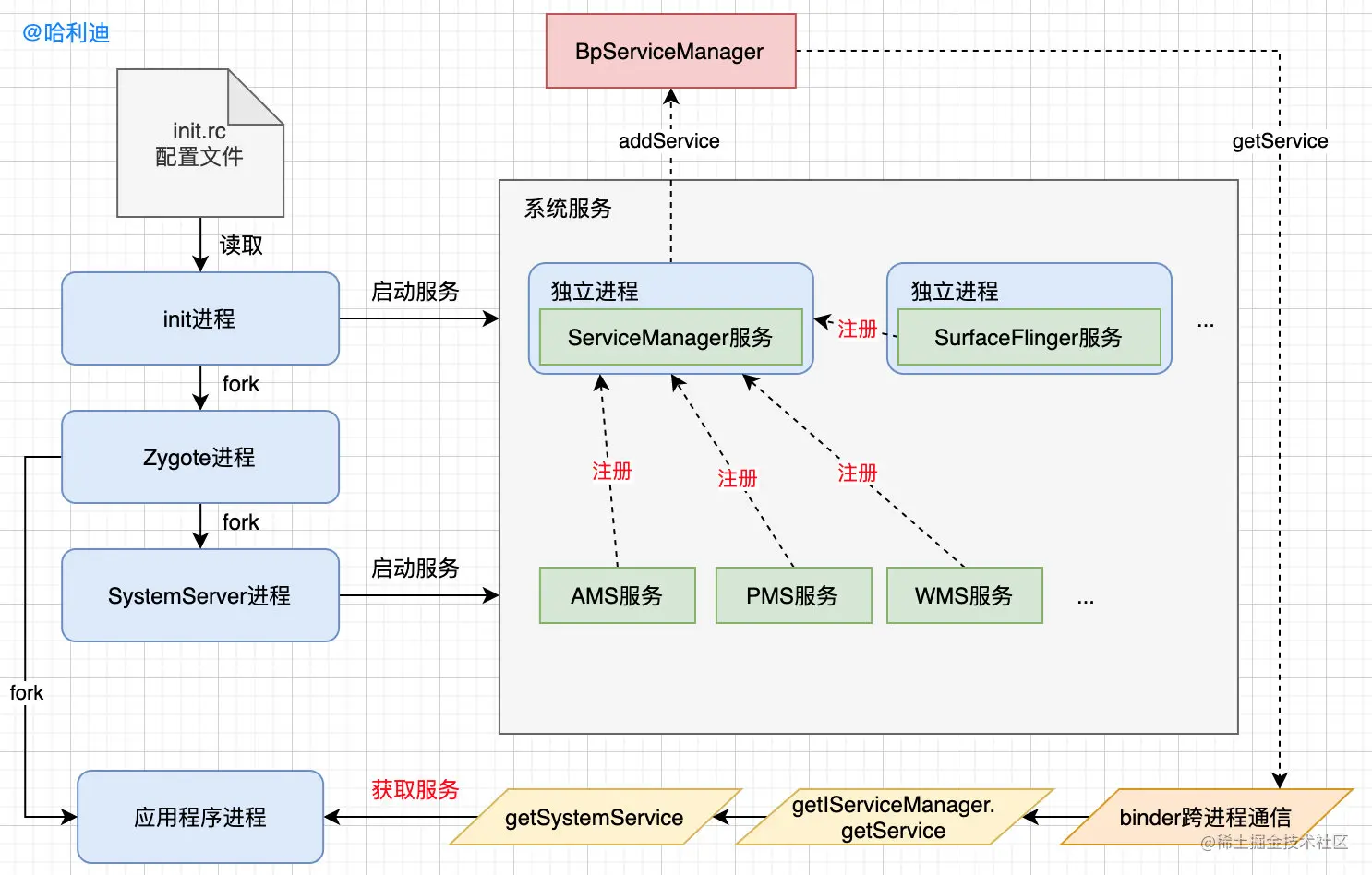 综上,不管是由init进程启动的独立进程的系统服务如SurfaceFlinger,还是由SystemServer进程启动的非独立进程的系统服务如AMS,都是在ServiceManager进程中完成注册和获取的,在跨进程通信上使用了Android的binder机制。