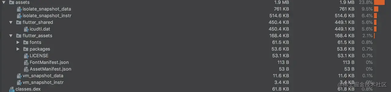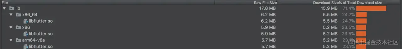 总大小是17.8M,占到整个apk安装包的71.4%,你可能会觉得好大,但是不用担心,因为Debug模式需要运行在模拟器上,所以才打入了x86_64和x86两个平台的so,所以会比较大,在Release模式下是不会打入x86_64和x86的,而且Google也在不断优化Flutter Engine的so大小。
