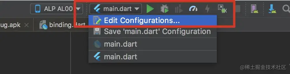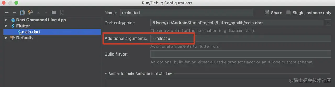 ,构建出来的就是 Release 模式,为空的话,就是 Debug 模式。或者,直接运行 Run -> Flutter Run 'main.dart' in Release Mode