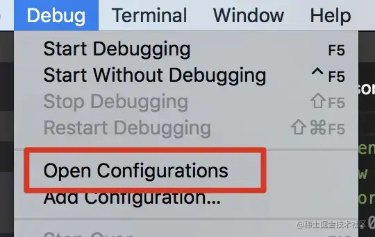 选择 Debug ,点击 Open Configurations,打开 launch.json,如下: