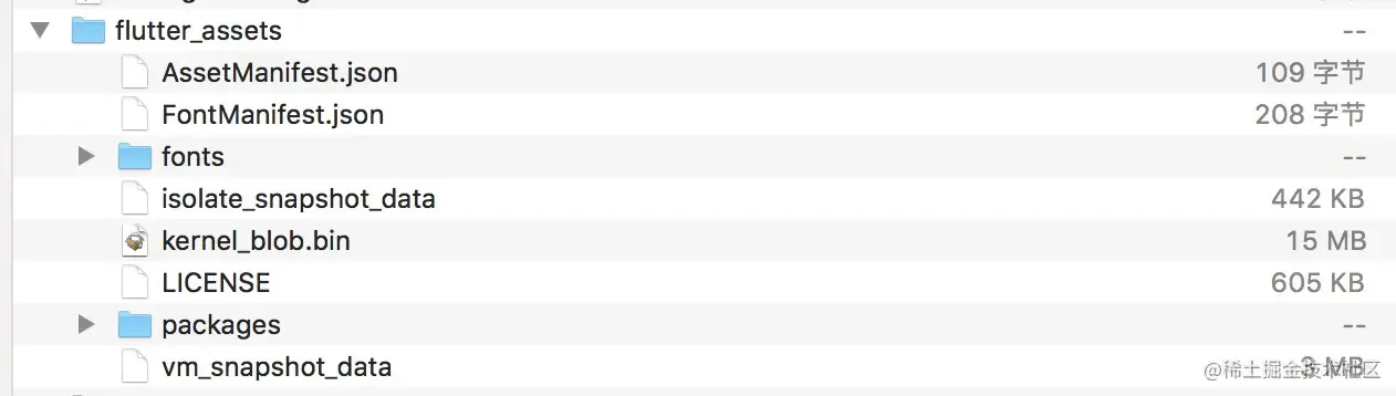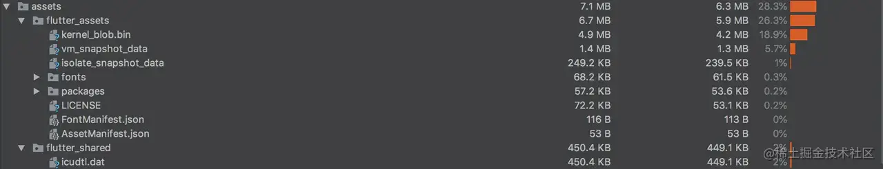 App.framework 总大小 26k,Flutter.framework 的总大小为 25.7M。Debug 模式下的大小没有参考意义,因为 Debug 不会是正式发布的包。