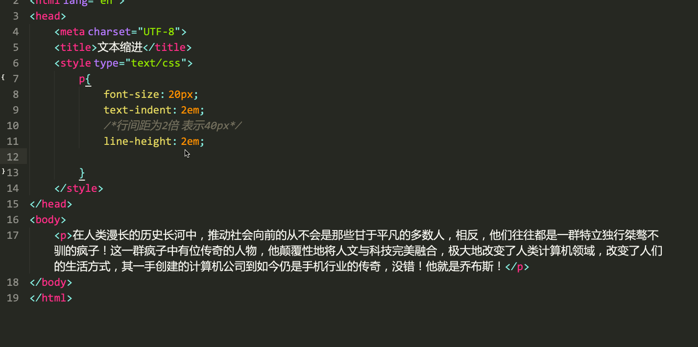 比如我们通常写文章的时候,首字母要空两格。那么我们需要使用text-indent属性来实现。它的属性值是像素(px、em、rem)单位。