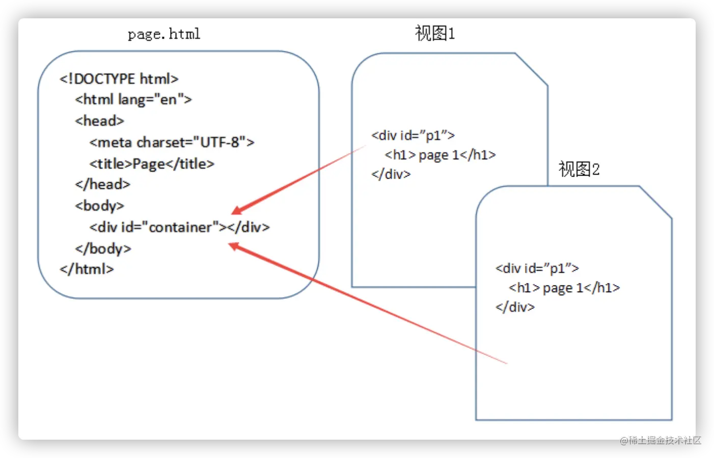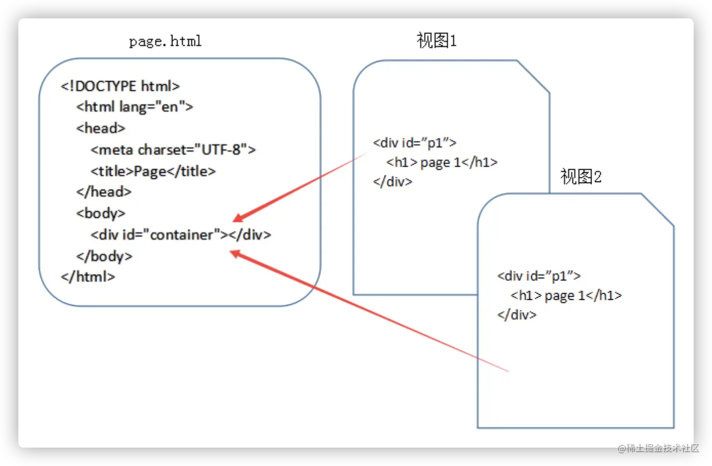 上面的代码,将视图1跟视图2都写入div中,放入container里,然后通过前端路由将它渲染出来