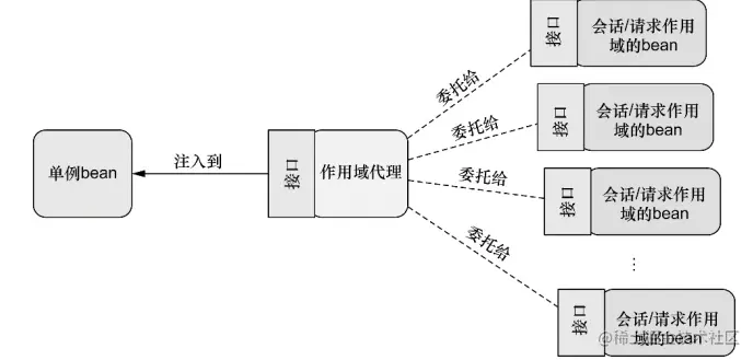 @Scope提供了proxyMode属性来解决这个问题。proxyMode指定了是基于接口代理还是类代理。