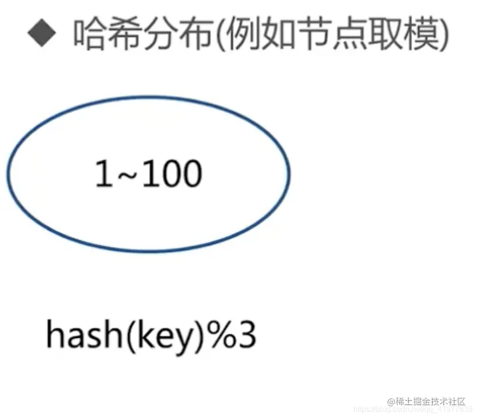 - 使用特点的数据(包括redis的键或用户ID),再根据节点数量N,使用公式:hash(key)%N计算出一个0~(N-1)值,来决定数据映射到哪一个节点上。即哈希值对节点总数取余。