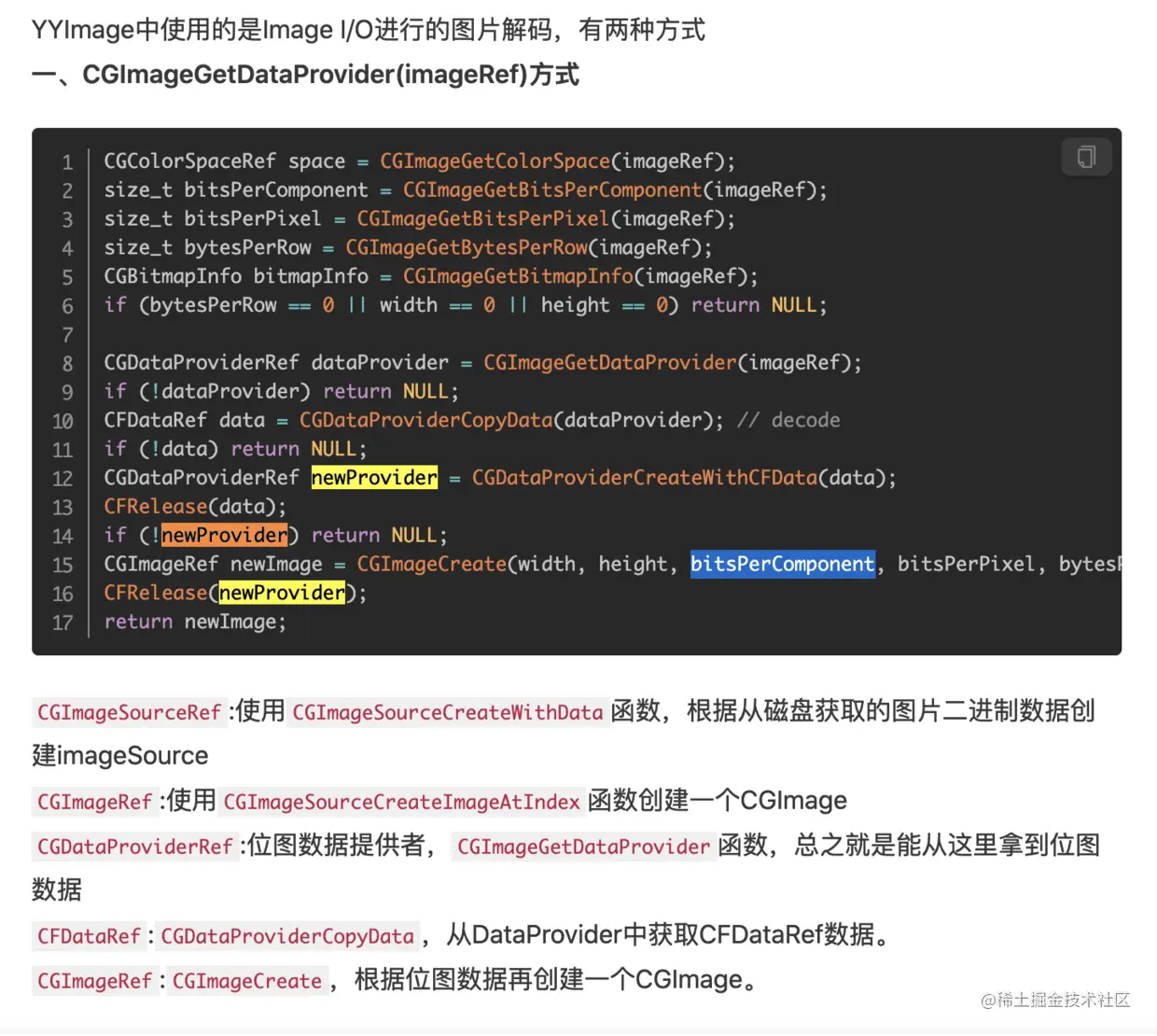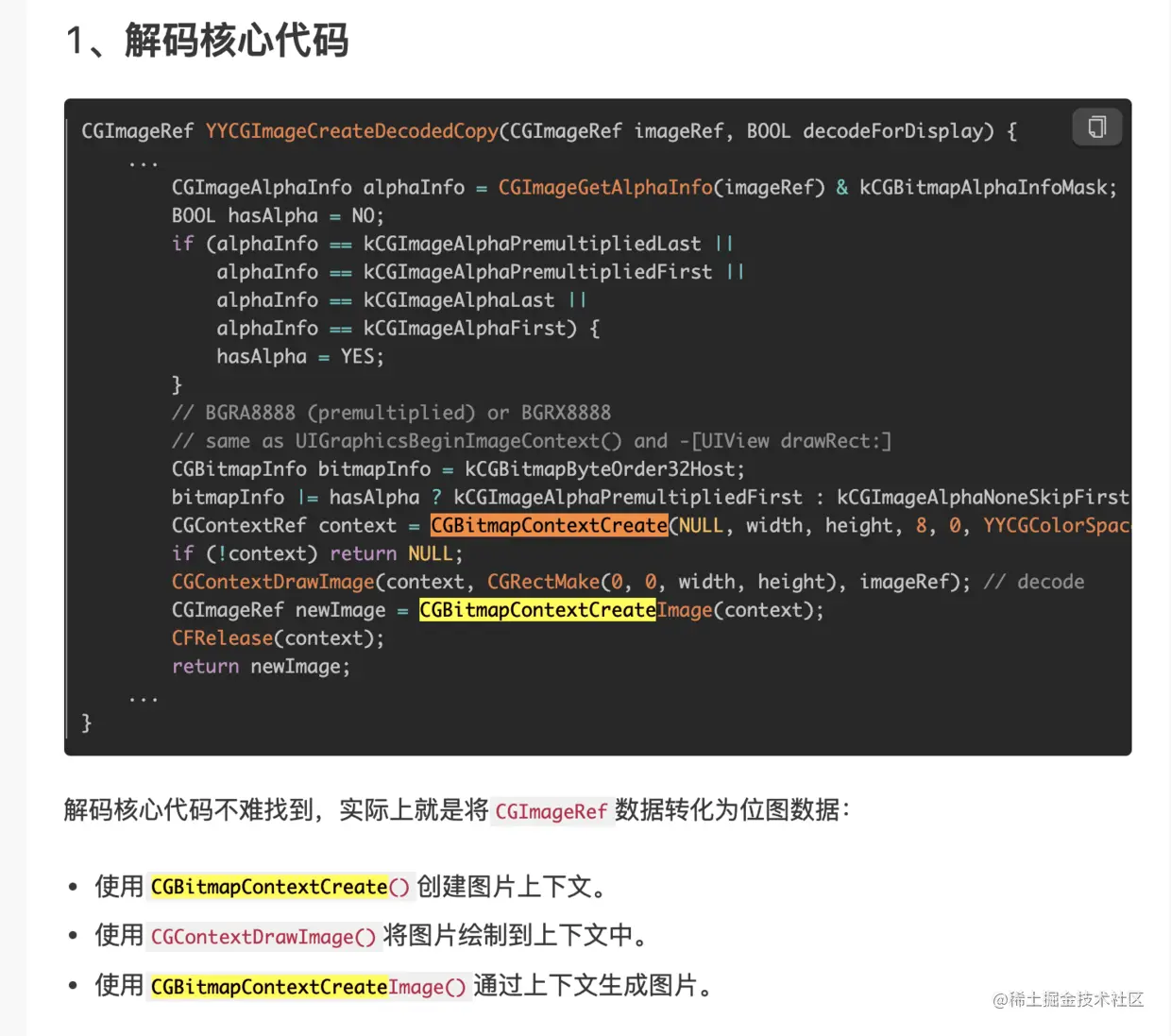 当你用 UIImage 或 CGImageSource 的那几个方法创建图片时,图片数据并不会立刻解码。图片设置到 UIImageView 或者 CALayer.contents 中去,并且 CALayer 被提交到 GPU 前,CGImage 中的数据才会得到解码。这一步是发生在主线程的,并且不可避免。