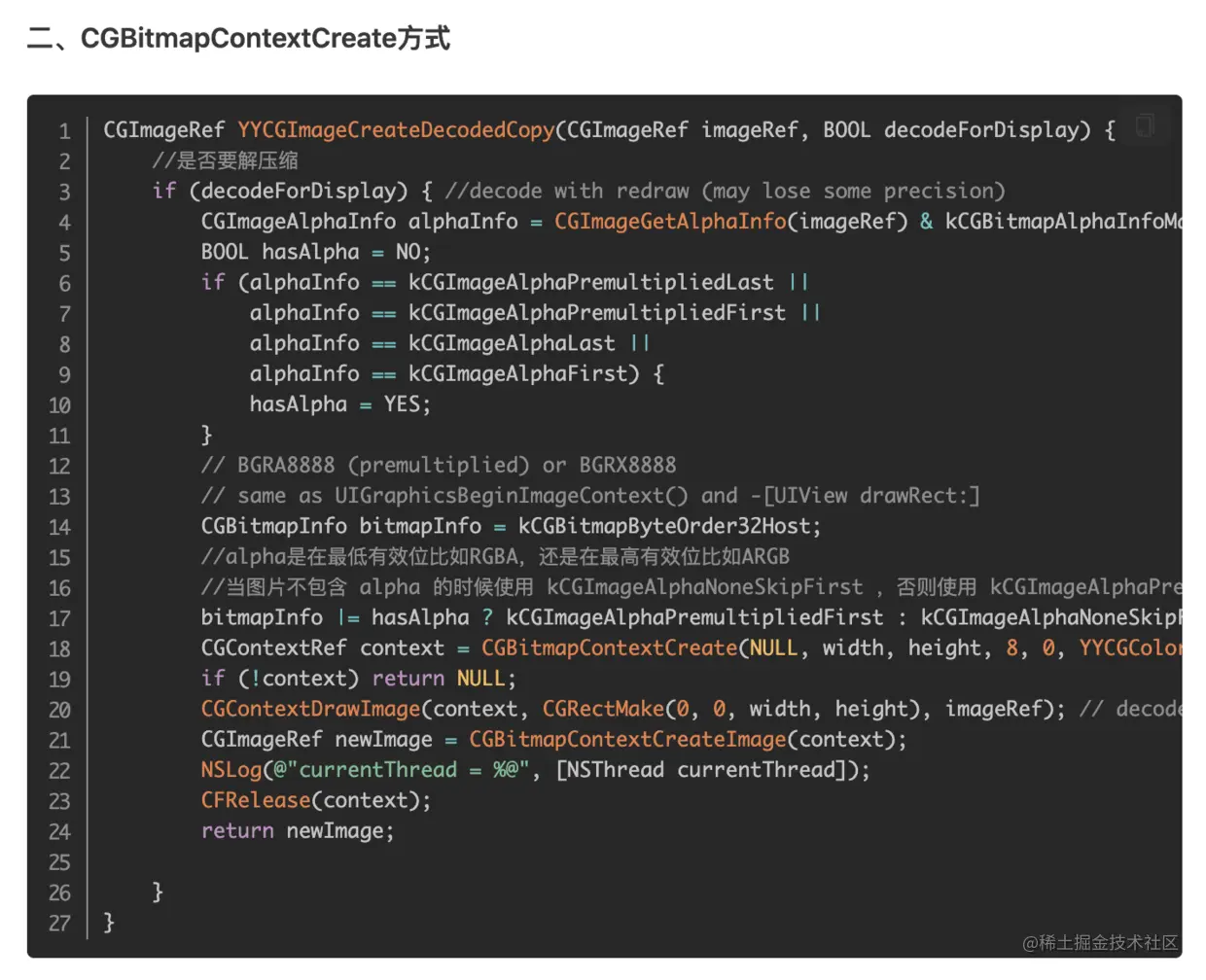 解压是耗时的,而系统默认是在主线程执行,所以业界通常有一种做法是,异步强制解压,也就是在异步线程主动将二进制图片数据解压成位图数据,使用CGBitmapContextCreate(...)系列方法就能实现。