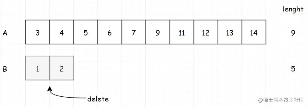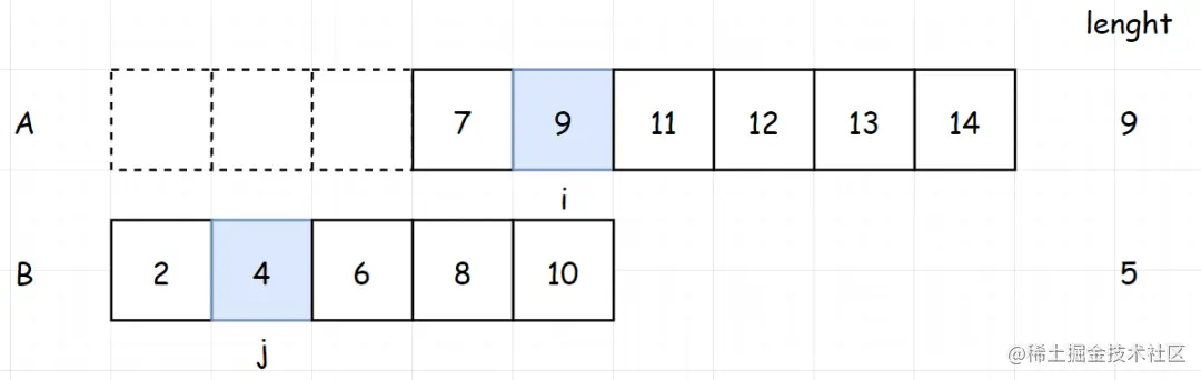 由于我们已经排除掉了 3 个数字,现在对于两个数组,我们需要找到7-3=4的数字,来进行下一步运算。我们可以继续删掉4/2=2个数。我们比较i和j的值,删除小的一边。