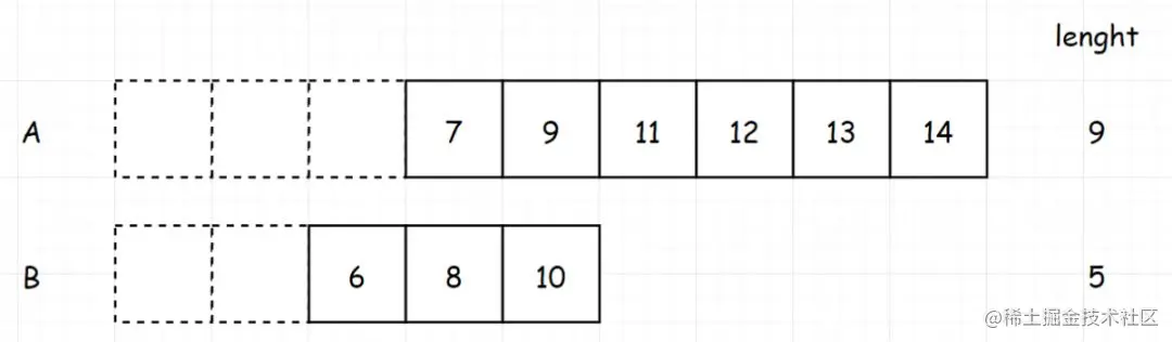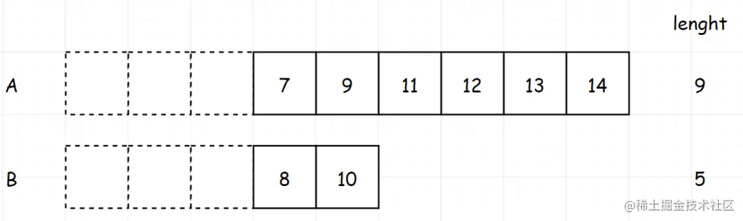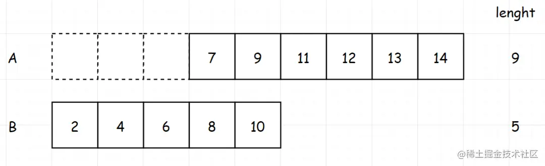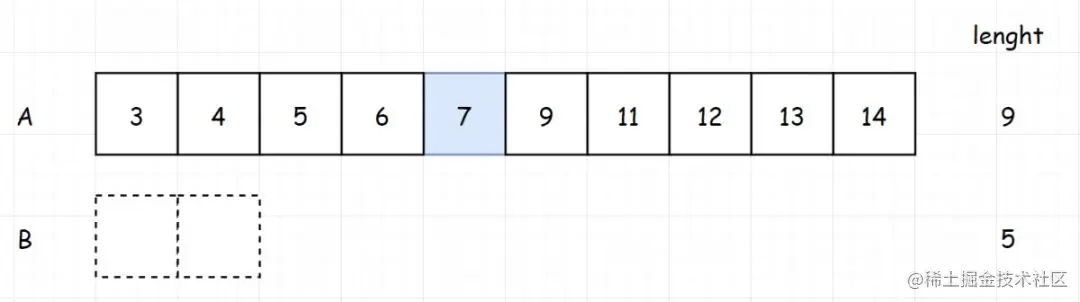 那如果是两个数组,也是一样的,我们先求出两个数组长度之和。如果为奇数,就找中间的那个数,也就是 (长度之和 1)/2 。如果为偶数,那就找 长度之和/2。比如下面的 (9 5)/2 = 7,那我们最终就是找到排列第7位的值。此时,问题其实已经转化为“找到两个数组中第k小的元素”。找到了第7位之后,第8位我们已经知道了,然后第7位和第8位的和,除以2就是我们要找的中位数(注意:这里的7和8你其实是不知道的,图中画出来,只是为了帮助理解)