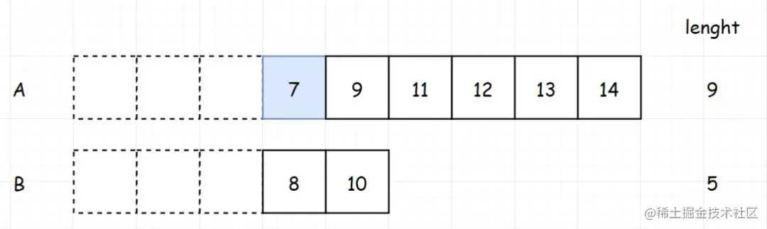不要忘记我们的目的,我们是为了找第7小的数。此时,两个数组的第一个元素,哪个小,就是我们要找的那个数。因为7<8,所以7就是我们要找的第7小的数。