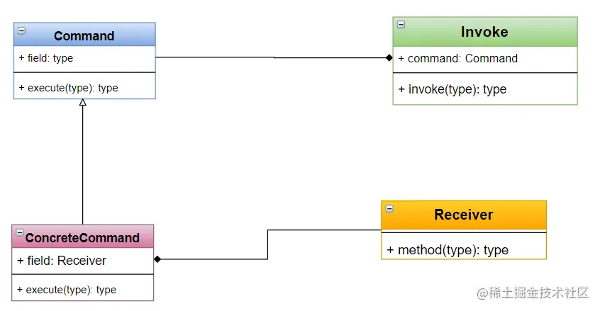 Invoke。执行者,对外暴露的接口,用户操作他实现业务调用Command。抽象类或者接口,提供需要被调用的方法ConcreteCommand。抽象类或者接口的实现类,实现具体的调用逻辑Receiver。接收者,接收具体的命令并且执行命令