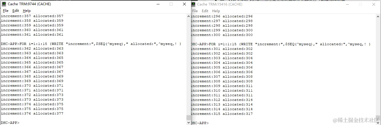 FOR i=1:1:15 {WRITE "increment:",$SEQ(^myseq)," allocated:",^myseq,! }