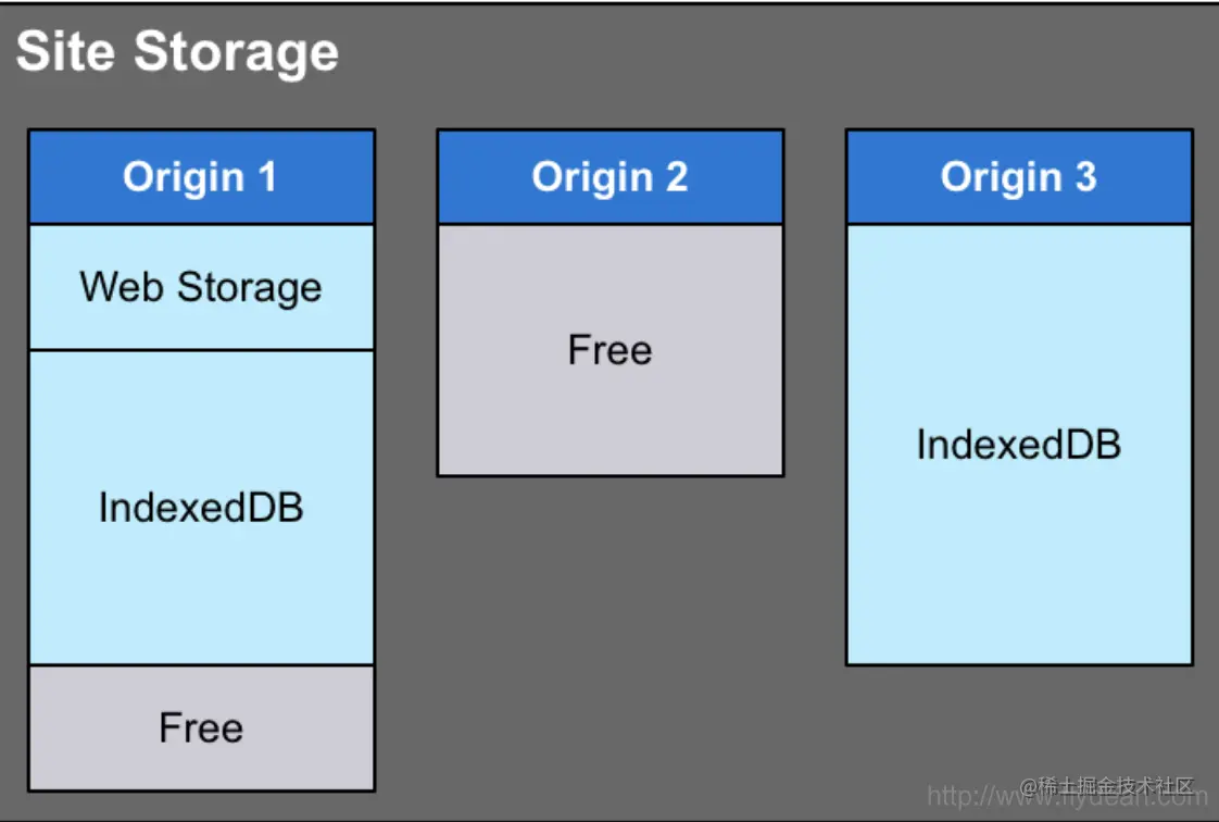 上图中Origin 1中既有Web Storage,也有IndexedDB的存储,因为并没有达到Storage的最大值,所以还留有一定的空余空间。