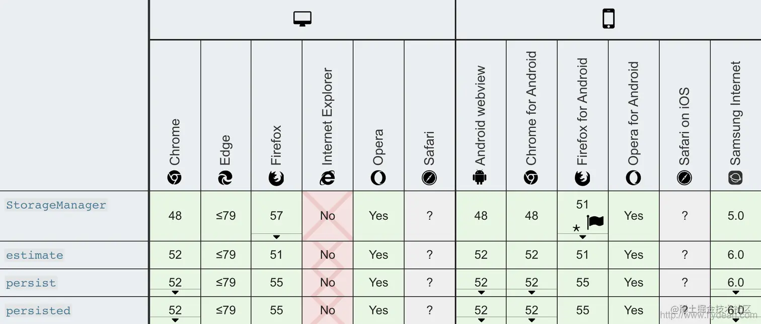 Storage API指的就是StorageManager,它有三个非常重要的方法estimate,persist和persisted,我们看下他们的浏览器兼容性: