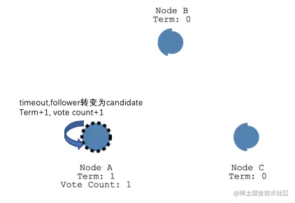 每个term开始时,会重置选举timeout。在一个term中,Follower会等待timeout的时间,如果超出这个时间还没有得到其他节点的选举请求,Follower会主动转变为Candidate,并且term+1,意味着开启了新的选举周期。