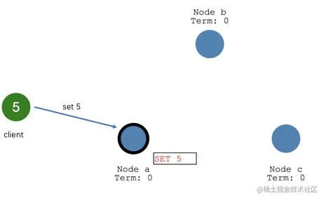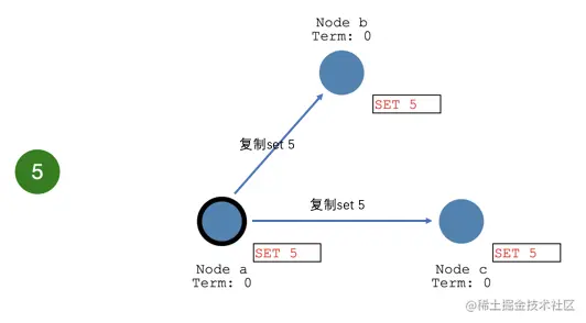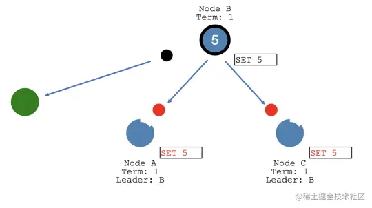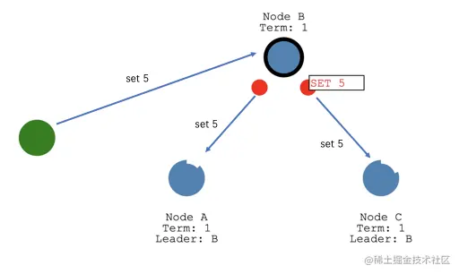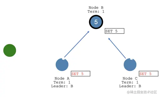 - 客户发送set 5 给Leader, 在下一个心跳timeout,Leader将set 5的日志记录发给Follower。
