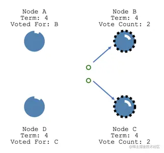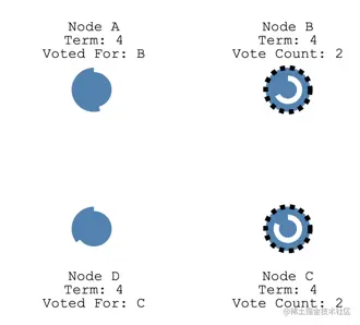 节点A,D分别响应节点B,C的请求,这时候两个Candidate节点由于得到的Vote都是2,不满足大于n/2的条件,则其不能转变为Leader节点,继续等待timeout至新的term开始并开启新一轮的选举,只到符合条件为止。