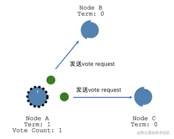 当Follower转变为Candidate之后,term加1, 然后开始新一轮的选举。Candidate首先会将自己的Vote Count 加1,然后发送请求选举的消息给其他节点。