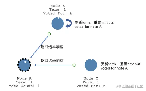 接收节点首先会比较term的大小,如果自己的term小于Candidate的term,则更新自己的term和Candidate的term保持一致,并重置timeout。如果接收节点在这个term中还没有做任何选举,则会返回选举响应消息给Candidate节点。
