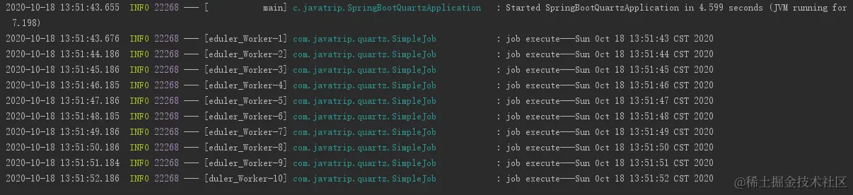 启动项目后,任务立即执行,每秒执行一次,10s后停止,执行效果图如下: