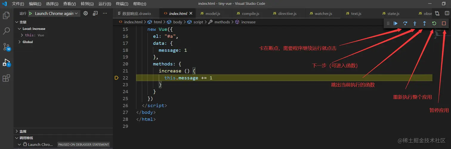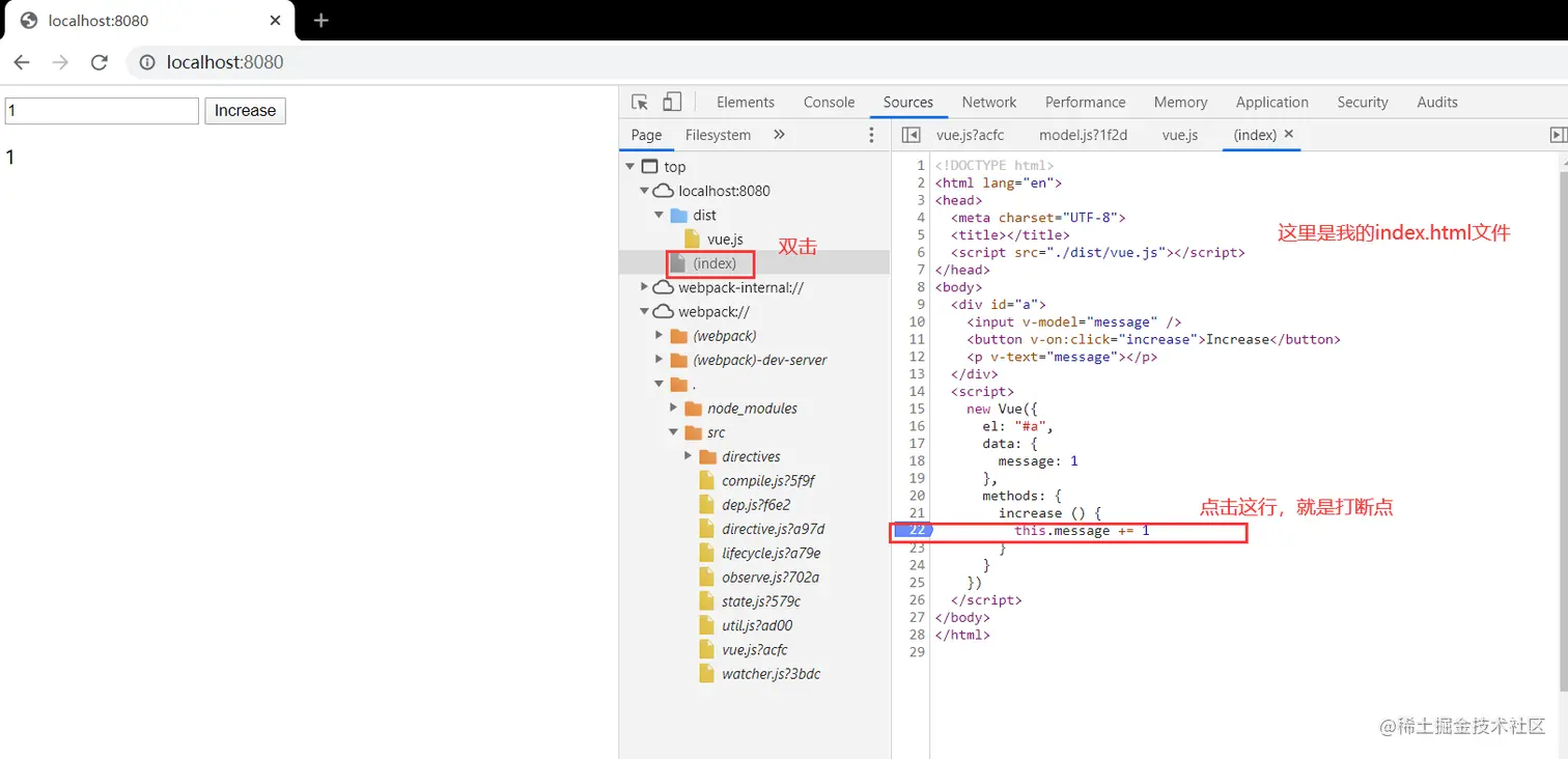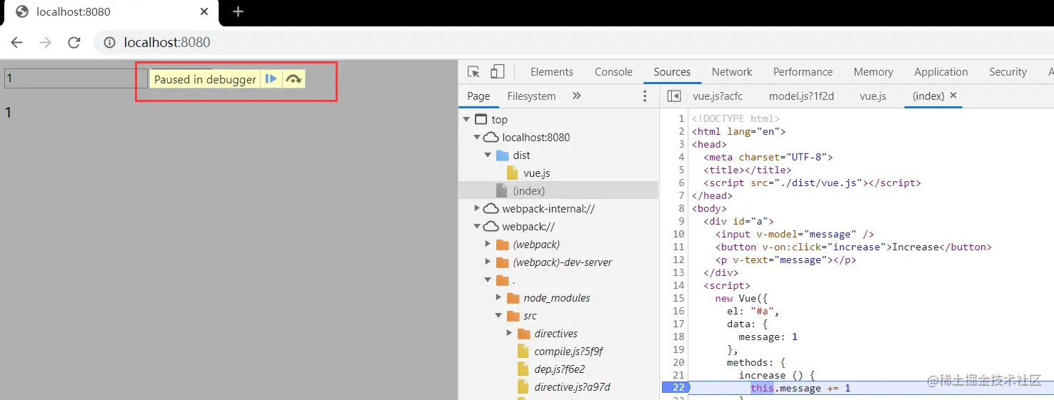 我们在浏览器上按f12,然后打开sources模块,点击index文件,出现的就是我们的代码文件内容,点击第22行,打下断点。然后点击increase按钮,就会出现如下情况,即断点调试。