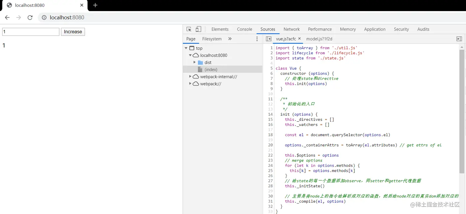 上图是个简单的Vue的数据驱动demo,输入框里是1,然后点击increase按钮,那么p标签的内容就变成2。