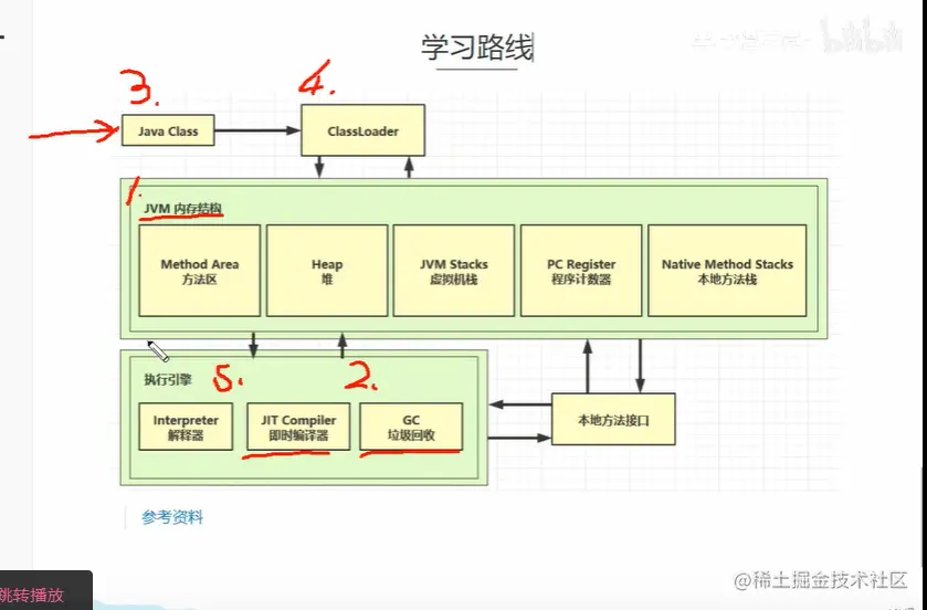javac编译器将.java源码编译成.class字节码文件。类加载器将.class字节码文件放到到jvm内存的方法区内。执行引擎将放在jvm中的字节码文件翻译成机器码供机器cpu使用,这个过程需要通过调用其他语言的本地接口调用实现。