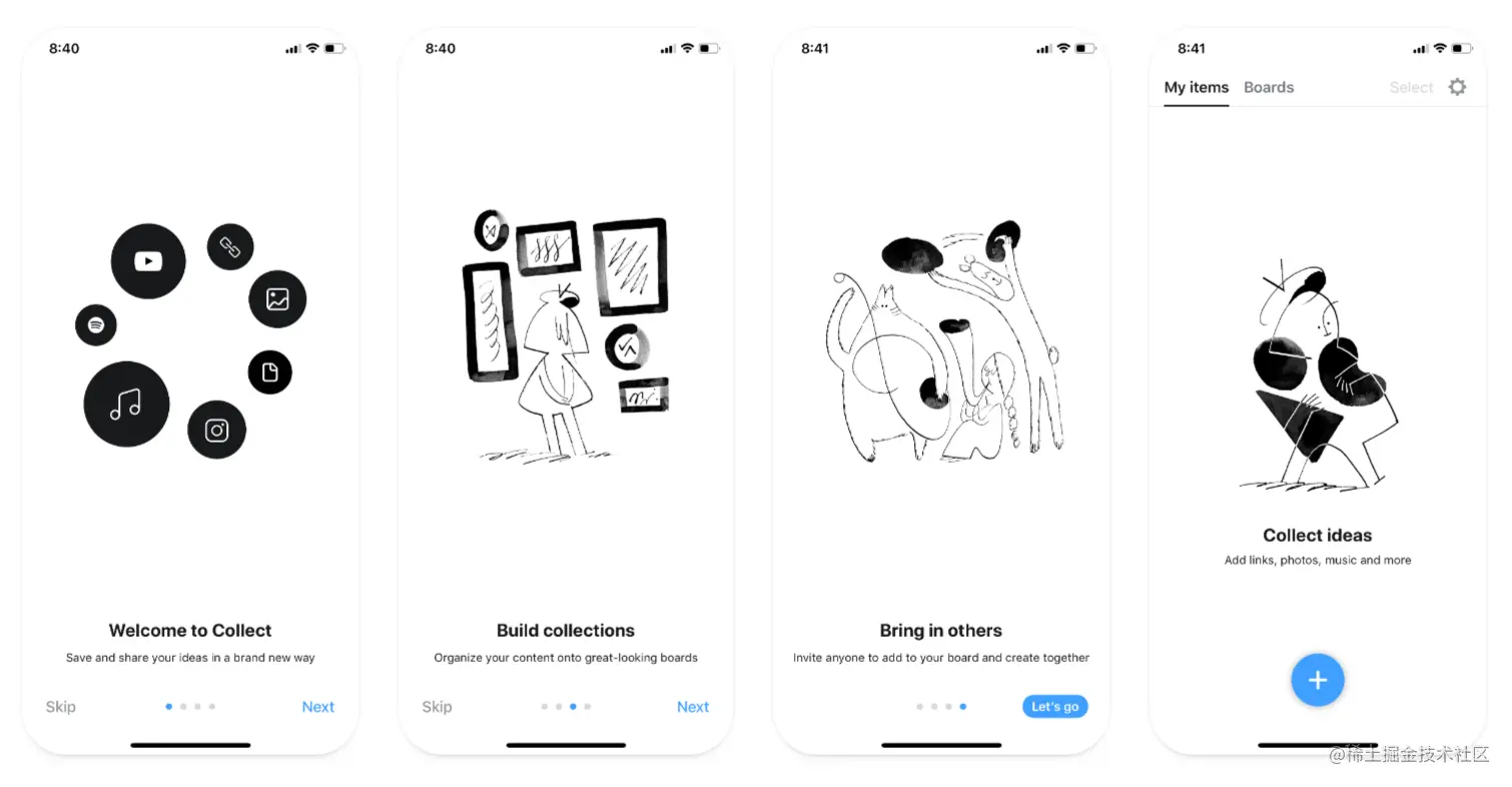 App启动页、引导页设计。分别是头一次和每次打开App时用户看到的画面。设计的目的是传达产品的核心功能,让用户更好的熟悉产品。然而数据表明,绝大多数用户对于启动页和引导页的关注度并不高,所以尽量减少引导页数量和画面内容,设计风格也推荐简洁明了,突出主题。
