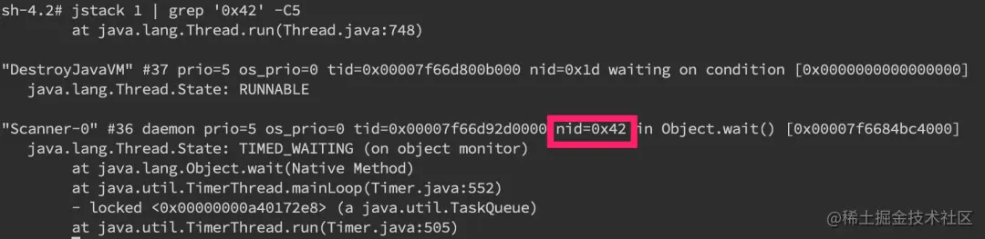 接着直接在jstack中找到相应的堆栈信息jstack pid |grep 'nid' -C5 –color