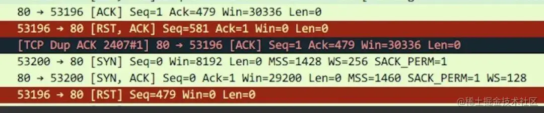 接下来我们通过wireshark打开抓到的包,可能就能看到如下图所示,红色的就表示RST包了。