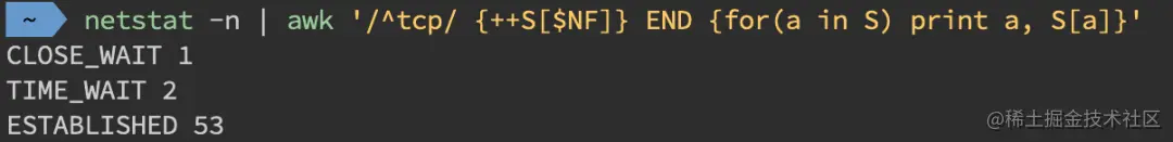 用ss命令会更快ss -ant | awk '{++S[$1]} END {for(a in S) print a, S[a]}'