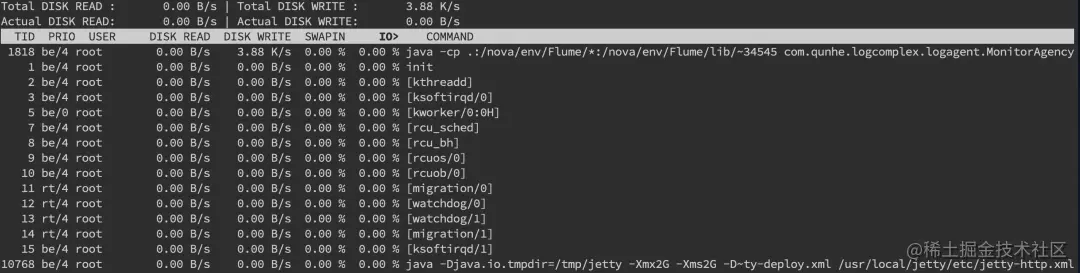 另外我们还需要知道是哪个进程在进行读写,一般来说开发自己心里有数,或者用iotop命令来进行定位文件读写的来源。