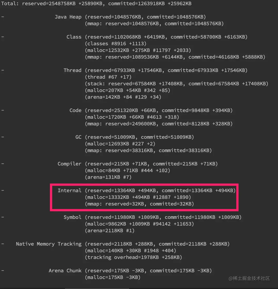 可以看到jcmd分析出来的内存十分详细,包括堆内、线程以及gc(所以上述其他内存异常其实都可以用nmt来分析),这边堆外内存我们重点关注Internal的内存增长,如果增长十分明显的话那就是有问题了。