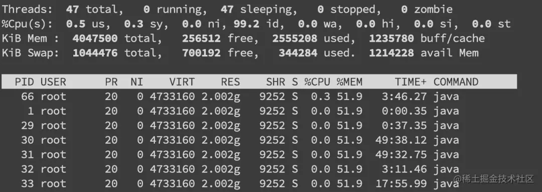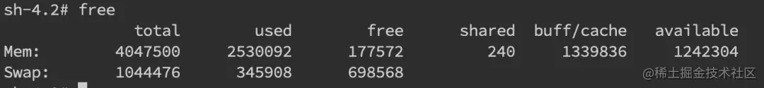 内存问题排查起来相对比CPU麻烦一些,场景也比较多。主要包括OOM、GC问题和堆外内存。一般来讲,我们会先用free命令先来检查一发内存的各种情况。