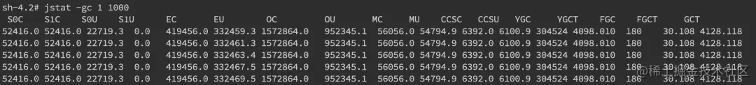 当然我们还是会使用jstack来分析问题,但有时候我们可以先确定下gc是不是太频繁,使用jstat -gc pid 1000命令来对gc分代变化情况进行观察,1000表示采样间隔(ms),S0C/S1C、S0U/S1U、EC/EU、OC/OU、MC/MU分别代表两个Survivor区、Eden区、老年代、元数据区的容量和使用量。YGC/YGT、FGC/FGCT、GCT则代表YoungGc、FullGc的耗时和次数以及总耗时。如果看到gc比较频繁,再针对gc方面做进一步分析。