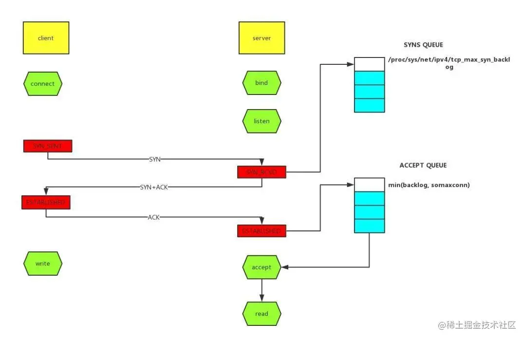 全连接队列的大小取决于min(backlog, somaxconn)。backlog是在socket创建的时候传入的,somaxconn是一个os级别的系统参数。而半连接队列的大小取决于max(64, /proc/sys/net/ipv4/tcp_max_syn_backlog)。