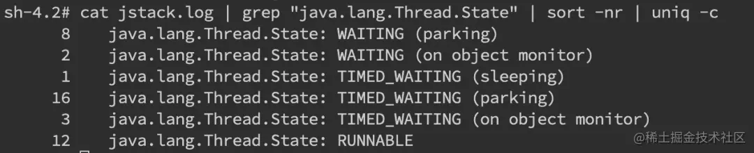 当然更常见的是我们对整个jstack文件进行分析,通常我们会比较关注WAITING和TIMED_WAITING的部分,BLOCKED就不用说了。我们可以使用命令cat jstack.log | grep "java.lang.Thread.State" | sort -nr | uniq -c来对jstack的状态有一个整体的把握,如果WAITING之类的特别多,那么多半是有问题啦。
