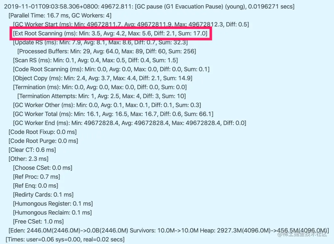 耗时过长问题就要看GC日志里耗时耗在哪一块了。以G1日志为例,可以关注Root Scanning、Object Copy、Ref Proc等阶段。Ref Proc耗时长,就要注意引用相关的对象。