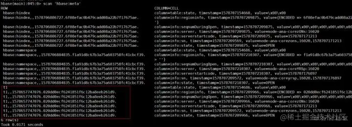 启动完成后,查看hbase:meta表的用户表记录,可以看到t1表的元数据都生成了。