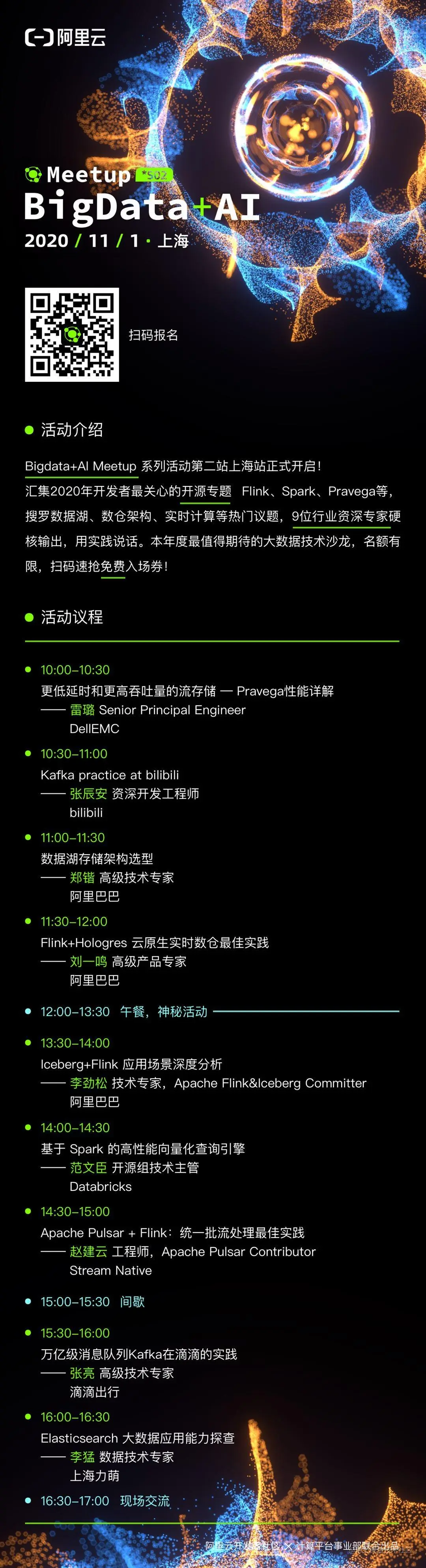 8个议题无不凸显宇宙真理:开源届前浪后浪全员凶猛,合体也成为主流。我们将会一睹Flink和Iceberg,Flink和 Hologres,Flink和Pulsar的深度融合的火花、Spark高性能向量化查询引擎解析、热度冲天的数据湖存储架构选型、bilibili 和滴滴的kafka平台优化方案;还有Elasticsearch、开源流式存储系统 Pravega 的实践探索也不容错过。