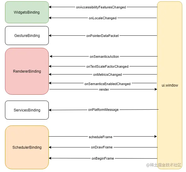 bindings 就是一些 Flutter Engine 和 Flutter框架 之间的胶水代码。在这两个Flutter模块(Flutter Engine 和 Flutter框架)之间,只有通过 bindings 才能交换数据。 (有一个例外,那就是 RenderView,我们后面会谈到)