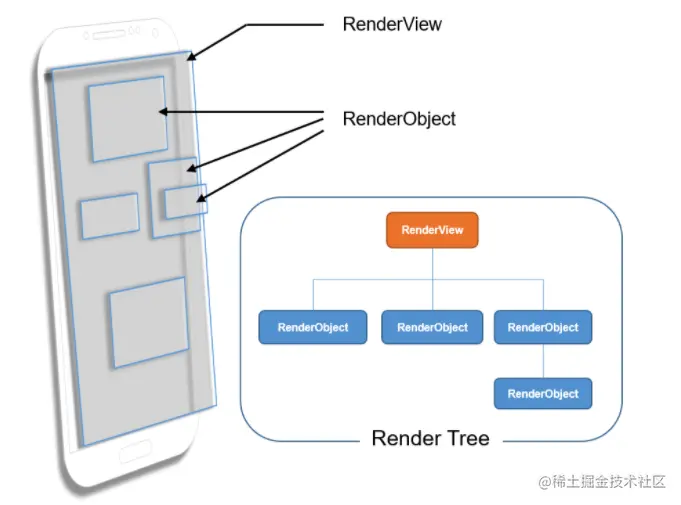 这一系列的 RenderObject 形成一棵树,这棵树被叫做 Render树 ;在树的最顶端(=root),我们会找到 RenderView.