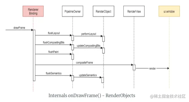 因为是 RendererBinding 负责处理 rendering tree ,所以在 WidgetsBinding 完成 build 的任务之后,它会调用 RendererBinding 的 drawFrame 方法来完成 render 工作。