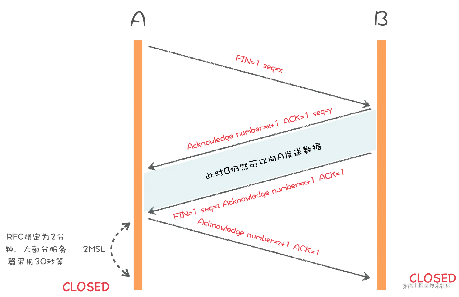 - 防止最后一次ACK请求对方没有收到,在超时后B重新发送FIN+ACK,A重发ACK