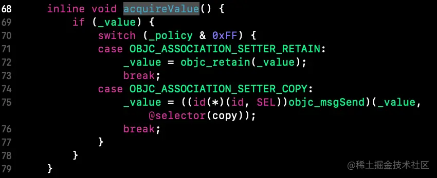如果是retain类型就调用objc_retain,如果是copy类型就发送copy消息。也就是对我们的策略类型进行处理,下面177行AssociationsManager方法,我们看下实现