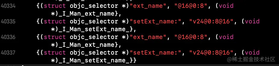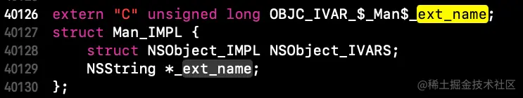 我们将main.m文件转成.cpp文件,看下C++的实现。我们先看属性ext_name的实现,带下划线的ext_name,并放到Man_IMP中