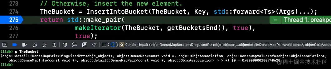 回到try_emplace方法,继续往下走找到TheBucket,我们打印下TheBucket