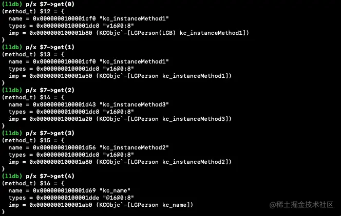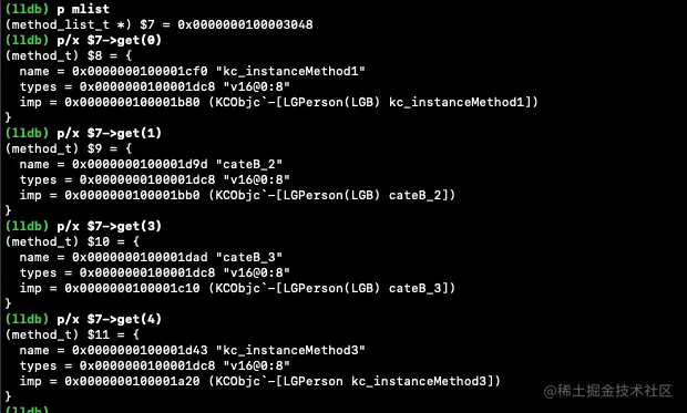 我们看到这个想起来cache_t,在编译器就编译成这样的,我们看到instanceMethod声明的方法。